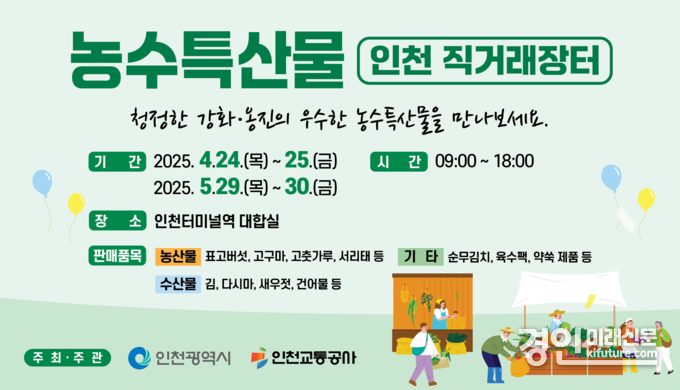 (경인미래신문=민경호 기자) 인천광역시(시장 유정복)는 4월과 5월의 마지막 주 목요일과 금요일, 2일간 인천터미널역에서 ‘2025년 상반기 비상설 직거래장터’를 운영(4월 24~25일, 5월 29~30일)한다고 밝혔다.