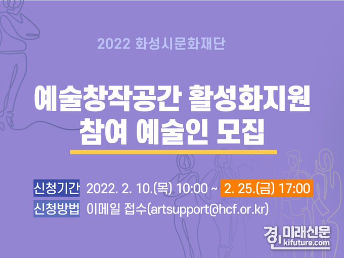 (경인미래신문=민경호 기자) (재)화성시문화재단이 화성시의 지역예술인 및 예술단체가 이용하는 작업실, 연습실 등의 창작공간 임차료를 지원하는 '2022 예술창작공간 활성화 지원사업'을 시행한다.