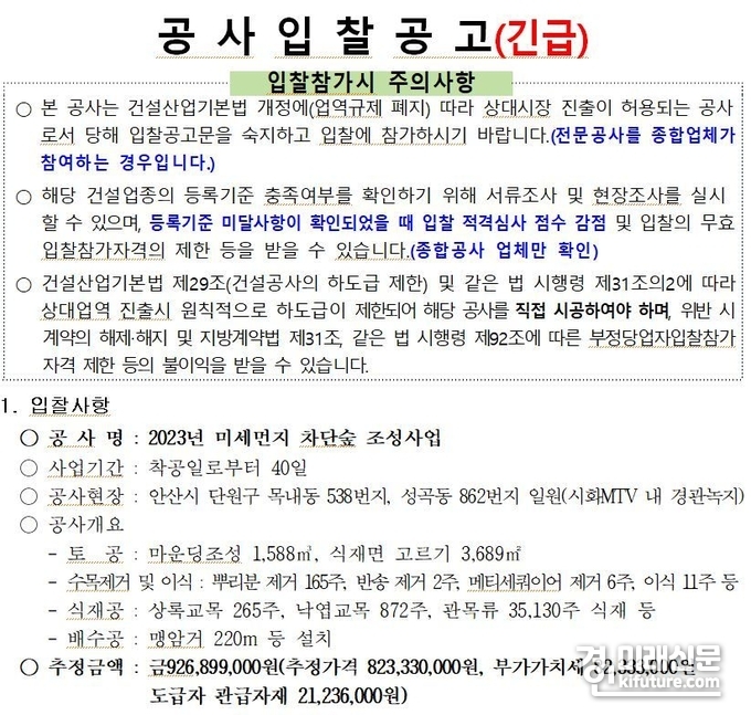 안산시는 '시화MTV 미세먼지 차단 숲' 조성을 위해 국비 5억원, 도비 1억 5000만원, 시비 3억 5000만원의 예산을 편성하고 공사입찰공고(긴급)를 지난 19일 마감하고 개찰했다.