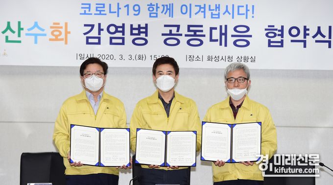 수원·화성·오산시는 지난 3일 화성시청 상황실에서 ‘감염병 공동대응을 위한 산수화 업무협약’을 체결하고 코로나19에 대한 공동대응을 강화하기로 했다. 협약 후 ‘산수화(오산·수원·화성) 감염병 공동 협의회’가 출범했다.