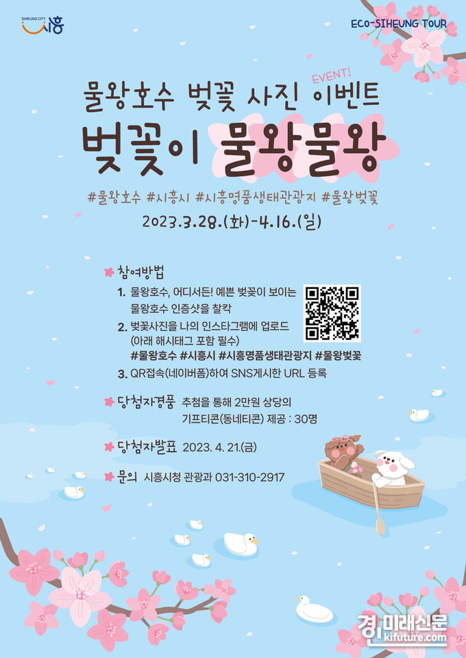 (경인미래신문=민경호 기자) 시흥시(시장 임병택)는 벚꽃시즌을 맞아 오는 28일부터 4월 16일까지 물왕호수 벚꽃사진 이벤트를 진행한다.