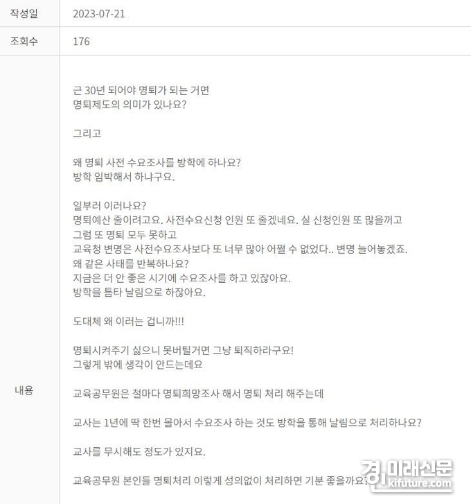 (경인미래신문=민경호 기자) 경기도교육청 '교육감에 바란다' 자유게시판에 명예퇴직 관련 행정절차에 대한 비판의 목소리가 끊이질 않고 있다.