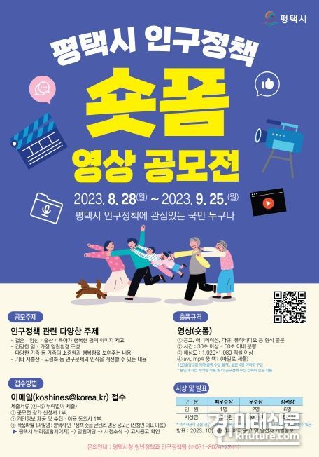 (경인미래신문=민경호 기자) 평택시는 결혼, 임신, 출산, 육아 등에 긍정적인 가치관을 심어줄 수 있는 ‘인구정책 숏폼 영상’을 오는 9월 25일까지 공모한다고 밝혔다.