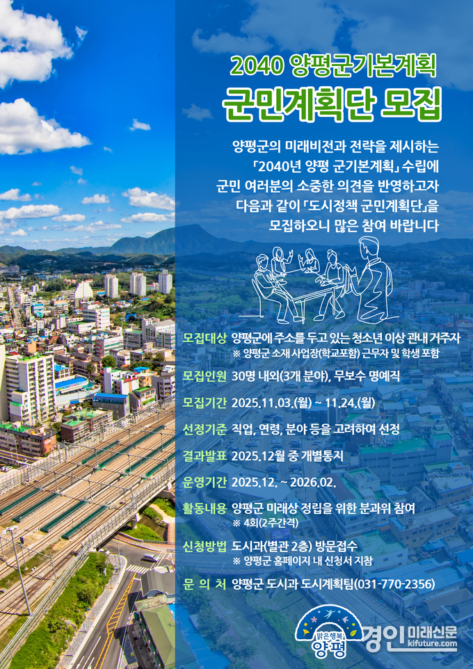 (경인미래신문=민경호 기자) 양평군(군수 전진선)은 3일부터 24일까지 미래 양평의 청사진을 그릴 ‘2040년 양평 군기본계획’ 수립을 위해 군민과 함께하는 ‘도시정책 군민계획단’을 모집한다고 밝혔다.