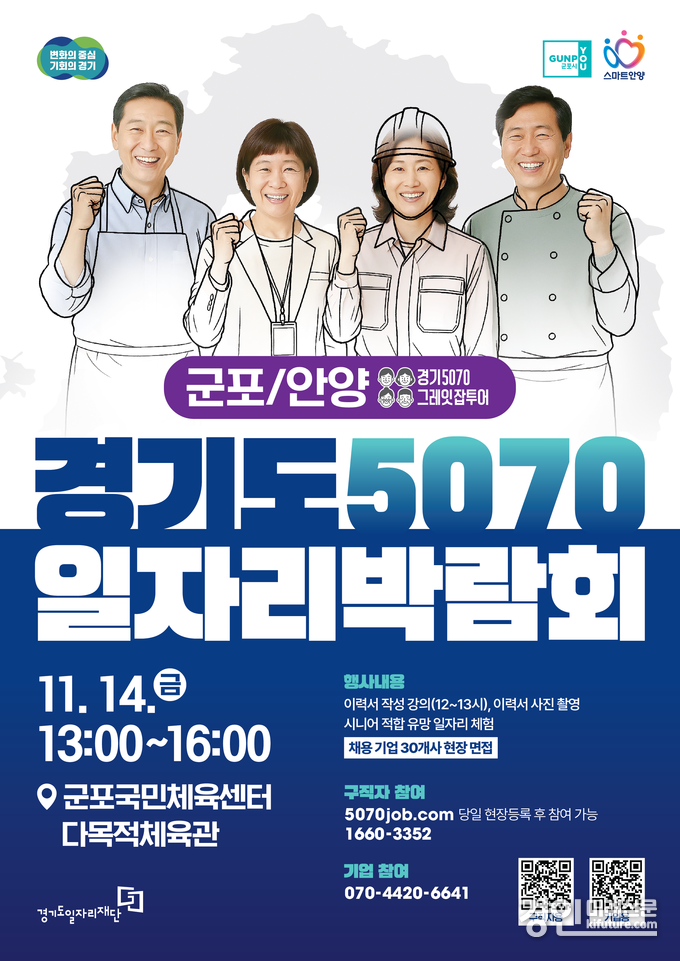 (경인미래신문=민경호 기자) 경기도와 경기도일자리재단은 50~70대 중장년층의 재취업을 지원하기 위해 오는 11월 14일 부곡동 군포국민체육센터에서 ‘2025 경기도 5070 일자리박람회 in 군포+안양’을 개최한다고 밝혔다.