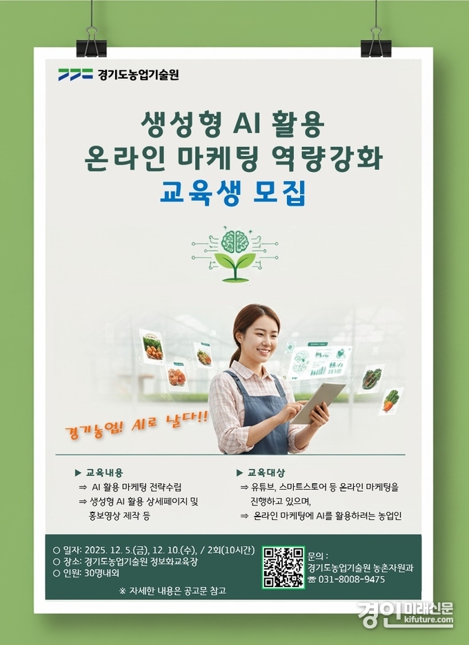(경인미래신문=민경호 기자) 경기도농업기술원은 오는 12일까지 ‘생성형 AI 활용 온라인 마케팅 역량강화 교육’에 참여할 농업인 30명을 모집한다.