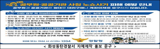 (경인미래신문=민경호 기자) 화성동탄경찰서(서장 총경 이태욱)는 국민건강보험공단과 협업하여 건강보험고지서 2면에 최근 급증하는 신종 피싱 범죄인 노쇼사기 범죄 예방 문구를 게재하는 방법으로 피싱 범죄 예방 홍보활동을 실시하였다.