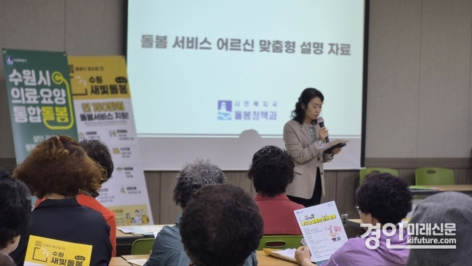 (경인미래신문=민경호 기자) 수원특례시(시장 이재준)는 4월 30일까지 경로당과 노인복지관 등 노인 이용 시설을 중심으로 ‘의료·요양 통합 돌봄 서비스’와 ‘수원새빛돌봄(누구나)’을 집중적으로 홍보한다.