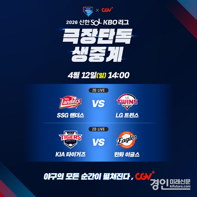 (경인미래신문=민경호 기자) CGV는 오는 12일 오후 2시에 진행되는‘SSG 랜더스 vs LG 트윈스’ 경기와 ‘KIA 타이거즈 vs 한화 이글스’ 경기를 생중계한다고 8일 밝혔다.