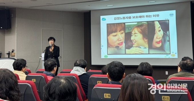 이날 교육에서는 대진대학교 감정노동산업재해예방센터 김황곤, 김지양 교수가 감정노동자 보호법과 모범지침을 비롯해 감정노동자의 특성과 심리 이해, 문제 상황별 대응 방안 등을 다뤘다.