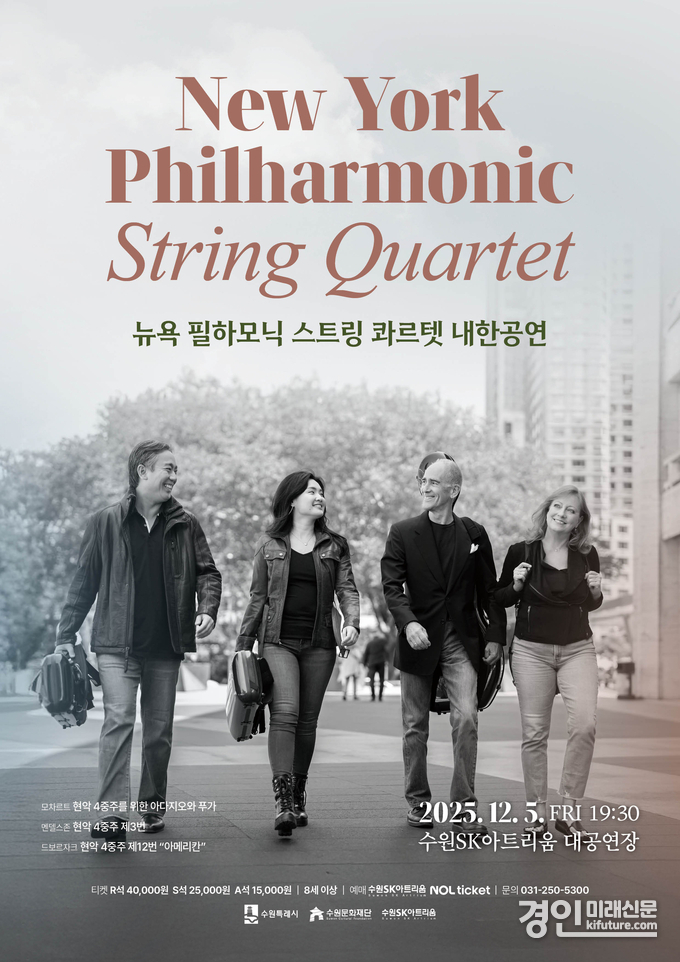 (경인미래신문=민경호 기자) 수원문화재단(대표이사 오영균)은 오는 12월 5일 오후 7시 30분, 수원SK아트리움 대공연장에서 ‘뉴욕 필하모닉 스트링 콰르텟 내한공연’을 개최한다.