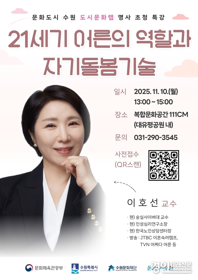 (경인미래신문=민경호 기자) 수원문화재단(대표이사 오영균)이 오는 10일 오후 1시 복합문화공간 111CM에서 심리학 전문가 이호선 교수를 초청해 시민 대상 인문심리 특강 '21세기 어른의 역할과 자기돌봄 기술'을 개최한다.