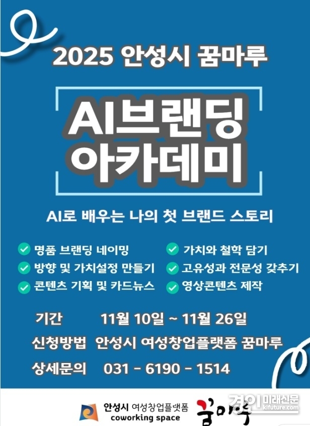 (경인미래신문=민경호 기자) 안성시(시장 김보라)는 디지털 가속화와 인공지능(AI) 활용 능력이 창업 경쟁력의 핵심으로 부상함에 따라, 여성(예비)창업자의 실전형 창업 역량 강화를 위해 나의 첫 강의안 만들기 “AI 브랜딩 실무 아카데미 과정”을 운영한다고 밝혔다.