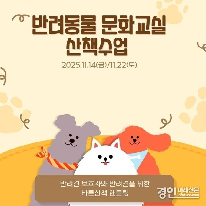 (경인미래신문=민경호 기자) 시흥시(시장 임병택)는 오는 11월 14일과 22일 반려동물과 함께하는 문화교실(산책 수업)을 운영한다.