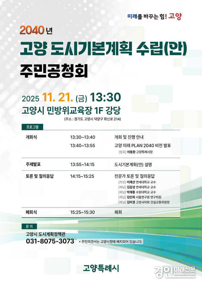 (경인미래신문=권민준 기자) 고양특례시(시장 이동환)는 오는 21일 오후 1시 30분 고양시 민방위교육장 1층에서 2040년 고양도시기본계획 수립을 위한 주민 공청회를 개최한다고 밝혔다.