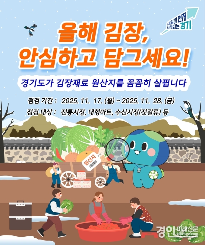 (경인미래신문=민경호 기자) 경기도는 김장철을 맞아 오는 17일부터 28일까지 배추김치와 김장채소 양념류에 대한 원산지표시 점검을 한다.