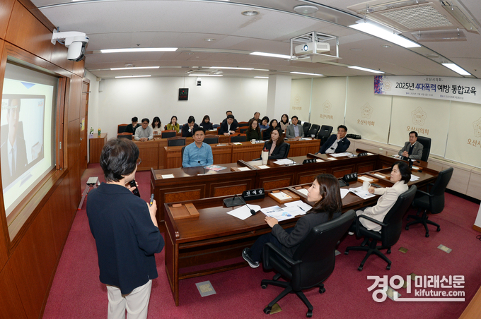(경인미래신문=민경호 기자) 오산시의회(의장 이상복)는 14일 의회 제2회의실에서 의원과 의회사무과 직원을 대상으로 ‘4대 폭력(성희롱·성매매·성폭력·가정폭력) 통합 예방교육’을 실시했다.