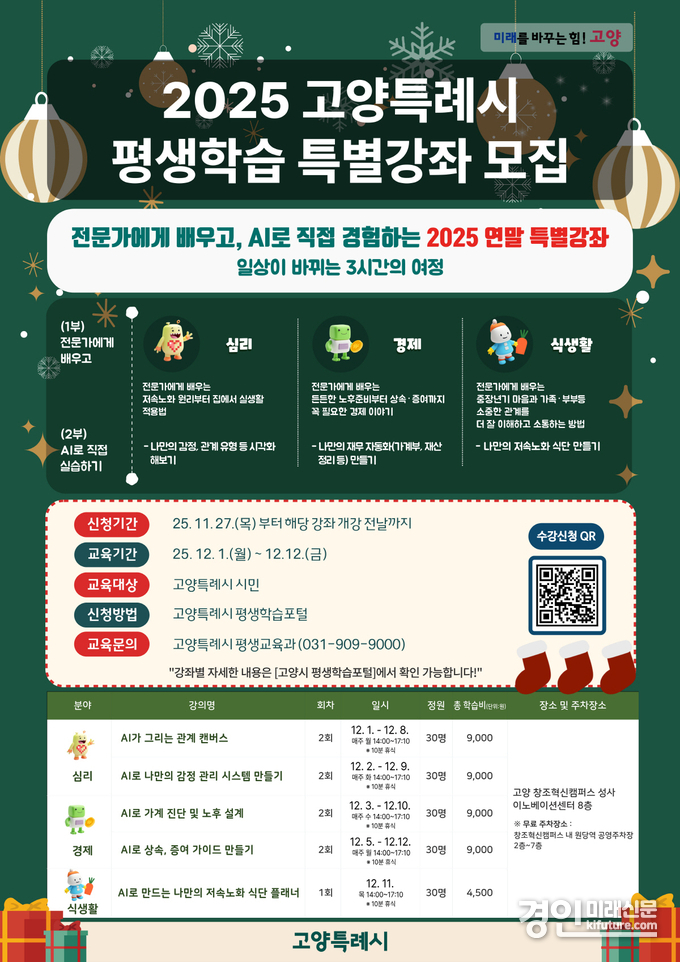 (경인미래신문=권민준 기자) 고양특례시(시장 이동환)는 지난 상반기부터 진행된 평생학습 시민강좌가 시민들의 큰 호응을 얻은 데 힘입어 12월 1일 2025년을 마무리할 특별강좌를 운영한다고 밝혔다.