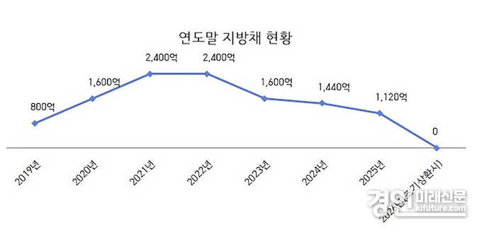 해당 지방채(2400억원)는 △2023년 1600억원 △2024년 1440억원 △2025년 1120억원으로 점차 줄었다.