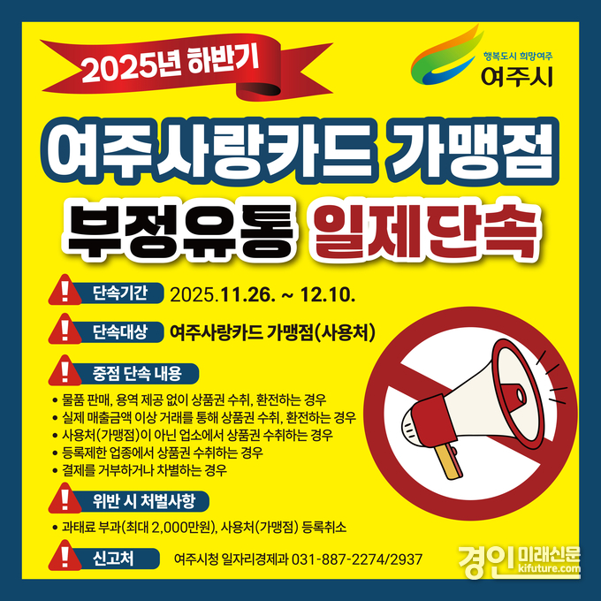 (경인미래신문=민경호 기자) 여주시(시장 이충우)는 지역화폐인 여주사랑카드의 부정유통 근절을 위해 지난 오는 12월 10일까지 집중 단속에 나선다고 27일 밝혔다.