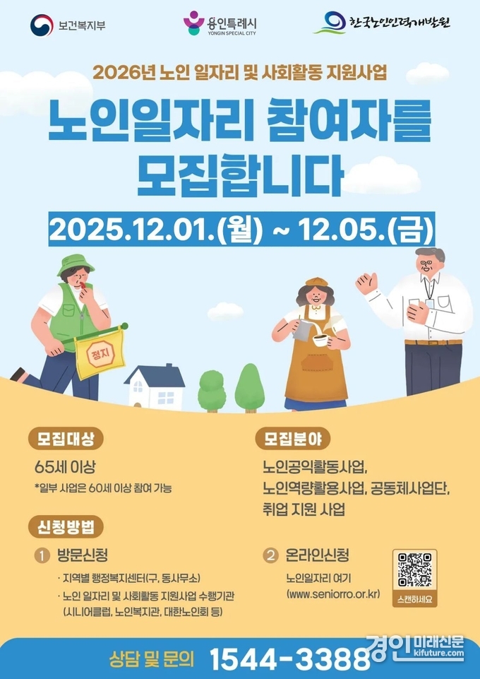 (경인미래신문=권민준 기자) 용인특례시(시장 이상일)는 12월 1일부터 5일까지 ‘2026년 노인 일자리 및 사회활동 지원사업’ 참여자를 모집한다.