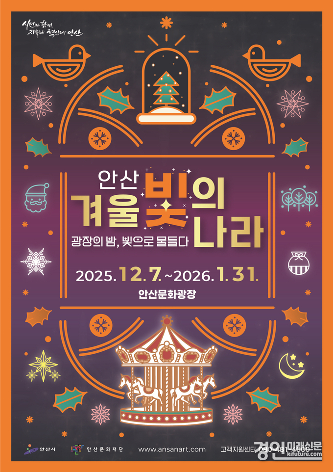 (경인미래신문=민경호 기자) 안산시(시장 이민근)는 주말인 오는 7일을 시작으로 내년도 1월 31일까지 두 달여 간 고잔동 안산문화광장 일대에서 겨울 야간 축제, ‘2025 안산 겨울 빛의 나라’를 개최한다고 1일 밝혔다.