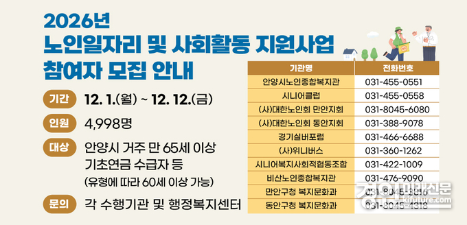 (경인미래신문=민경호 기자) 안양시가 오는 12일까지 건강하고 활기찬 노후를 위한 ‘2026년 노인일자리 및 사회활동 지원사업’의 참여자 4998명을 모집한다.