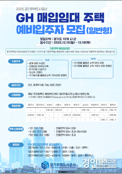 (경인미래신문=민경호 기자) 경기주택도시공사(GH)는 1일 일반형 및 청년형 매입임대주택 예비입주자를 각각 12월 15일부터 모집한다고 밝혔다.