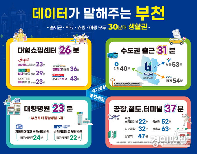 (경인미래신문=민경호 기자) 부천시민은 아침에 집을 나서 직장으로 향할 때 평균 31분이면 출근을 마칠 수 있다. 쇼핑센터를 방문하거나 병원을 이용할 때도 대부분 30분 안팎이면 충분하고 버스 터미널·기차역·공항까지 이동하는 데에도 평균 37분이면 도착 가능하다.