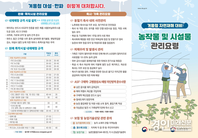 이밖에도 겨울철 재해 예방을 위한 가축관리, 시설물 관리요령, 전기화재 예방 리플릿을 배포하여 지속적인 피해예방 요령을 홍보할 예정이다.
