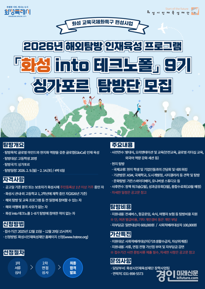 (경인미래신문=민경호 기자) 화성시인재육성재단은 글로컬 인재 육성 프로그램인 화성 into 테크노폴 9기 싱가포르 탐방단 20명을 오는 15일부터 29일까지 모집한다.