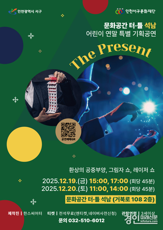 (경인미래신문=민경호 기자) 인천서구문화재단이 오는 19일부터 20일까지 2일간 문화공간 터·틀(석남)에서 어린이 연말 특별기획공연 'The Present'를 선보인다.
