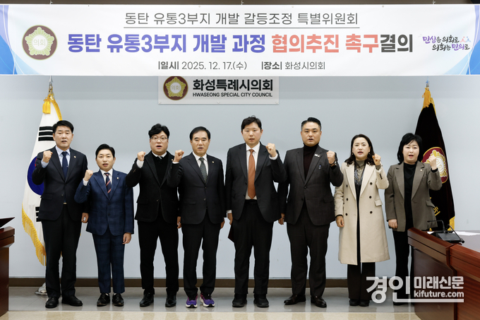(경인미래신문=민경호 기자) 화성특례시의회 '동탄 유통3부지 개발 갈등조정 특별위원회'(이하 특별위원회)는 17일 의회 대회의실에서 동탄 유통3부지 개발과정 협의추진 촉구결의를 진행했다.