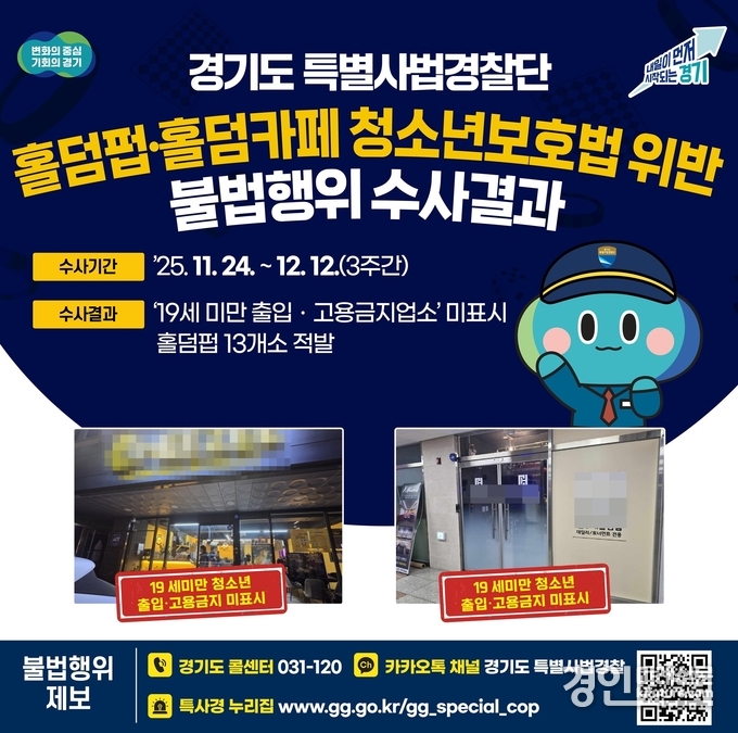(경인미래신문=민경호 기자) 경기도가 청소년 출입이 금지된 홀덤펍, 홀덤카페 108개를 대상으로 불법행위를 집중 수사한 결과 ‘청소년보호법’ 위반 사업장 13개소를 적발했다.