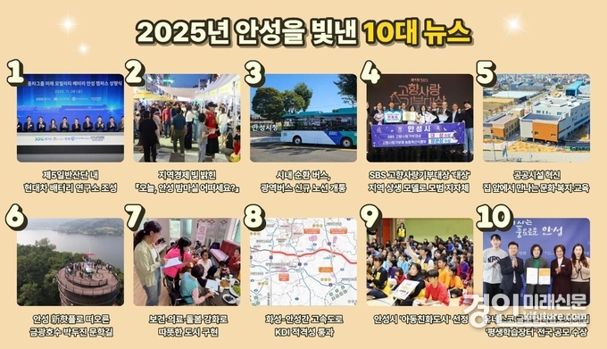 (경인미래신문=민경호 기자) 안성시는 올 한 해 추진한 주요 사업과 성과를 토대로 시민 대상 설문조사를 거쳐 2025년을 빛낸 10대 뉴스를 선정했다고 밝혔다.