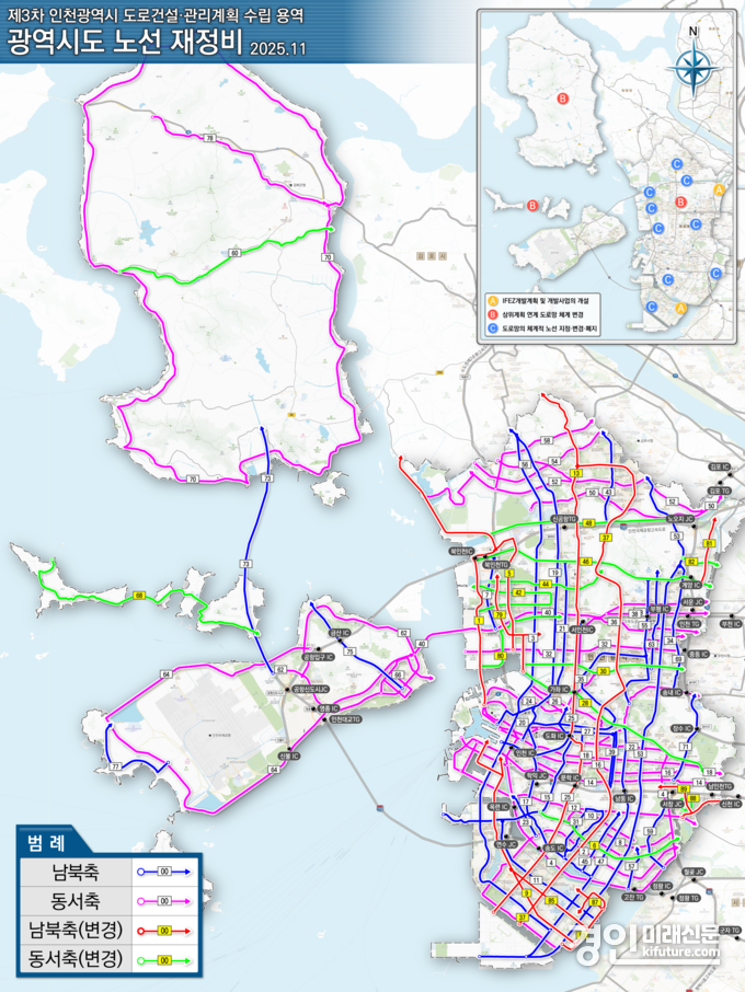 (경인미래신문=민경호 기자) 인천광역시(시장 유정복)는 22일 송도·청라경제자유구역 및 계양 테크노밸리(TV) 개발계획, 고속도로 건설 및 교통혼잡도로 개선사업계획 등 국가 상위계획을 반영해 광역시도 노선 체계를 재정비해 고시한다고 밝혔다.
