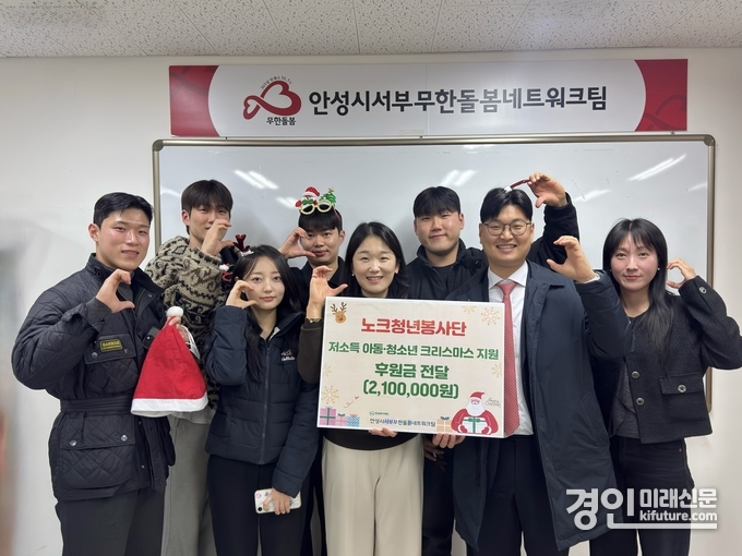 (경인미래신문=민경호 기자) 안성시 노크청년봉사단(회장 이용성)은 지난 22일 사회복지법인 한길복지재단(이사장 한창섭)에서 수탁 운영하는 안성시서부무한돌봄네트워크팀(센터장 유성아)에 저소득 아동·청소년 크리스마스 지원을 위한 후원금 210만 원을 전달했다고 밝혔다.