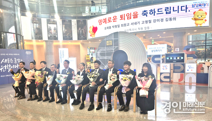 퇴임식은 오제홍 환경국장, 박형일 동부출장소장, 최원교 감사관을 비롯한 9명의 퇴직자 및 가족과 동료, 선후배 공직자들이 함께한 가운데 ▲인사발령통지서 교부 및 공로패 수여 ▲기념영상 및 축하공연 ▲퇴임사 등으로 진행됐으며 참석자들은 따뜻한 분위기 속에서 퇴직자들의 노고를 되새겼다.