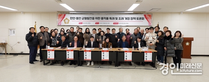 (경인미래신문=민경호 기자) 안양시의회 김경숙 의원(국민의힘, 석수1·2동·충훈동)은 지난 24일 시의회 소회의실에서 '만안·동안 균형발전을 위한 용적률 특례 및 조례 개정 정책토론회'를 개최하고, 만안과 동안 간 개발 격차 해소를 위한 다양한 정책 대안을 논의했다.
