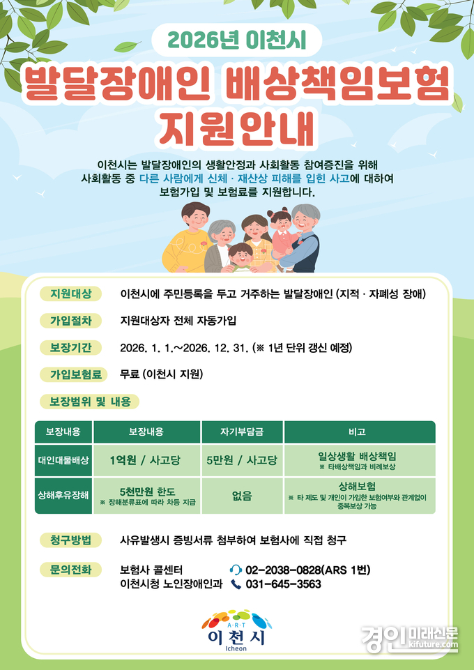 (경인미래신문=민경호 기자) 이천시(시장 김경희)는 2026년 1월 1일부터 경기도 최초로 발달장애인을 위한 배상책임보험 가입 지원을 시행한다고 밝혔다.