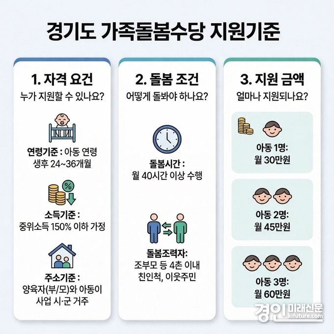 (경인미래신문=민경호 기자) 경기도 가족돌봄수당 사업 참여 시군이 지난해 14개에서 올해 26개 시군으로 늘어남에 따라 더 많은 도민들이 돌봄사업 혜택을 받게 됐다.