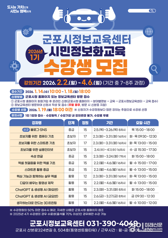 (경인미래신문=민경호 기자) 군포시(시장 하은호)는 시민들의 정보화 시대에 대한 적응 능력 향상 및 정보 소외 계층의 디지털 격차 해소를 위해 운영되는 ‘2026년 1기 시민정보화교육’의 수강생을 오는 1월 14일부터 1월 18일까지 모집한다고 밝혔다.