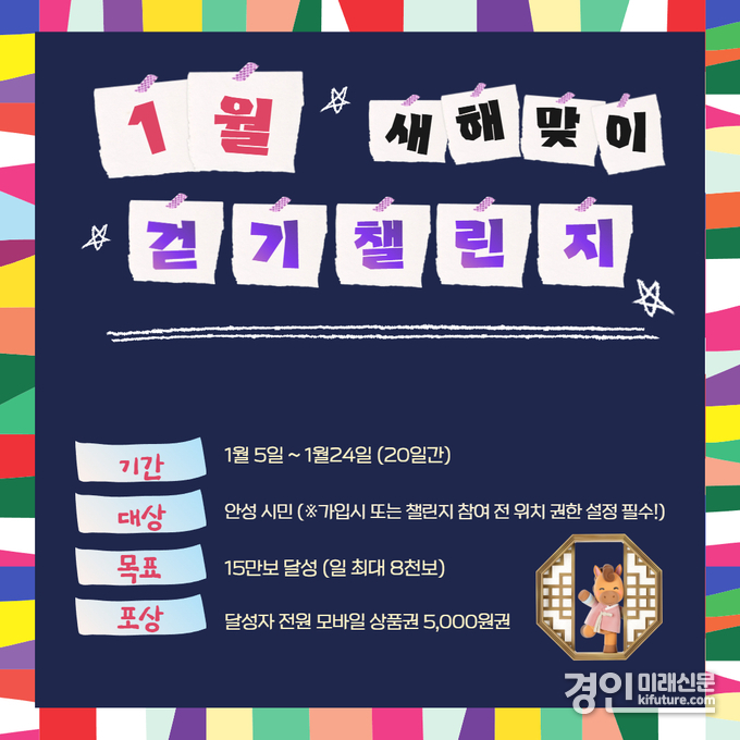 1월 걷기챌린지는 안성시민을 대상으로 1월 5일부터 24일까지 20일간 15만보 달성(1일 최대 8천보 인정)을 목표로 진행되며 목표를 달성한 참가자 전원에게 모바일 상품권 5000원권을 증정한다.