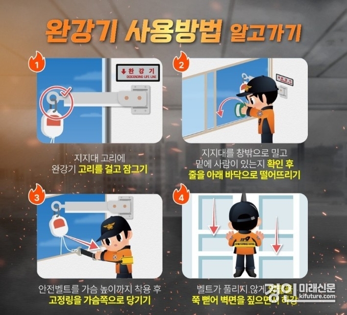 안성소방서는 완강기 사용 시 ▲창문 개방 및 지지대 설치 ▲후크와 속도조절기 결속 ▲지지대 고정 ▲로프 하강 준비 ▲안전벨트 착용 ▲벽면을 짚으며 천천히 하강하는 순서를 반드시 지켜줄 것을 당부했다.
