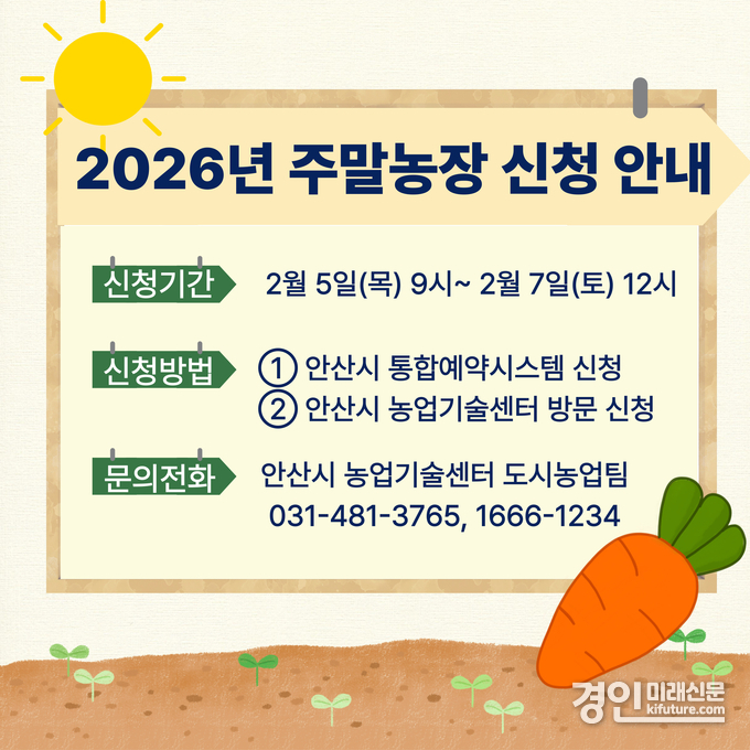 (경인미래신문=민경호 기자) 안산시(시장 이민근)는 다음달 5일부터 3일간 주말농장 신청 및 접수를 받는다고 12일 밝혔다.