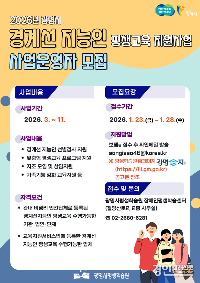 (경인미래신문=민경호 기자) 광명시(시장 박승원)는 ‘2026년 광명시 경계선지능인 평생교육 운영 지원사업’을 수행할 보조사업자를 오는 28일까지 공개 모집한다.