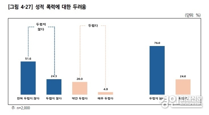 ‘성추행이나 성폭력 피해에 대한 두려움’(24.0%)도 높은 수준으로 나타나, 적어도 여성 4명 중 1명은 일상적으로 성적 폭력에 대한 두려움을 느끼고 있었다.
