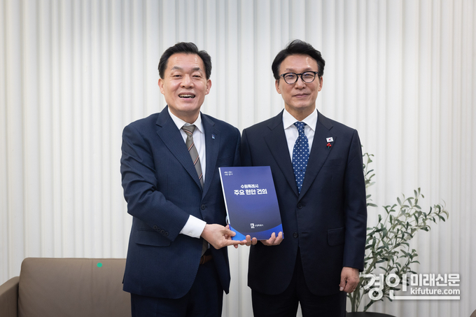 이재준 시장은 지난 16일 수원컨벤션센터를 찾은 김민석 총리를 만나 ▲수원 군공항 이전으로 ‘민·군 통합, 경제국제공항’ 국가전략 사업 추진 ▲국가 첨단산업 연구특구, 수원경제자유구역(K-실리콘밸리) 지정 ▲정조대왕능행차 국가대표 K-축제 지정·K-컬처로드 집중 육성 등 수원시 핵심 현안을 담은 건의문을 전달하고, 정부의 전폭적인 지원을 요청했다.