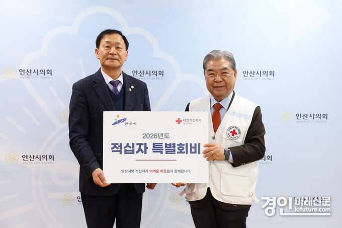 (경인미래신문=민경호 기자) 안산시의회(의장 박태순)가 20일 ‘2026년 적십자 특별회비 전달식’을 갖고 대한적십자사 경기도지사에 특별회비를 전달했다.