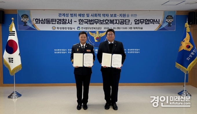 (경인미래신문=민경호 기자) 화성동탄경찰서(총경 이태욱)는 지난 20일 한국법무보호복지공단 경기남부지부와 관계성 범죄 예방 및 사회적 약자 보호·지원을 위한 업무협약을 체결했다.